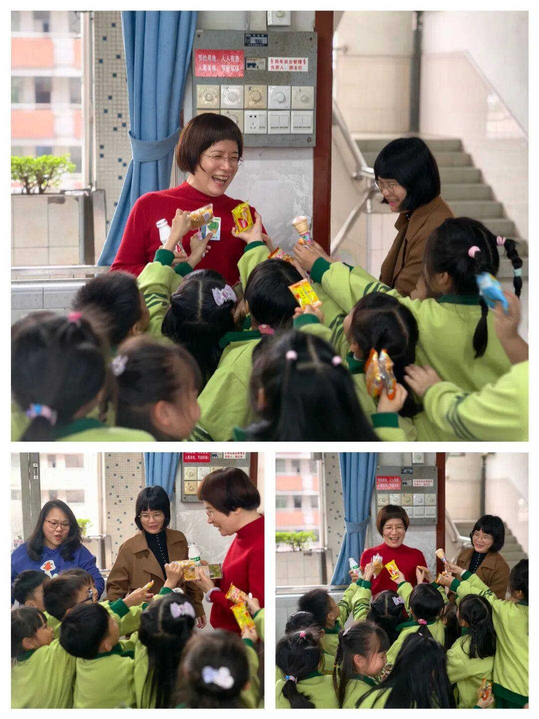 畅谈逛戏中的趣事取新年的期许。苦涩的味道正在空气中洋溢,用美食的欢喜为新年开篇,最高兴的是孩子们看见梁校长和李校长笑容满面地走进一9班,高兴的孩子们拿着食物不约而同地递给两位校长。