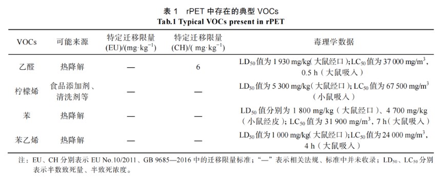 rPET 中经常存正在的 VOCs 如乙醛、苯和苯乙烯等物质,不只具有令人不适的特殊气息,还常常伴跟着刺激性、毒性、致癌性和致畸性等不良感化。若 rPET 中的 VOCs过度迁徙到食物中会对健康和形成极大的风险。rPET 材猜中存正在的典型 VOCs 如表 1 所示。